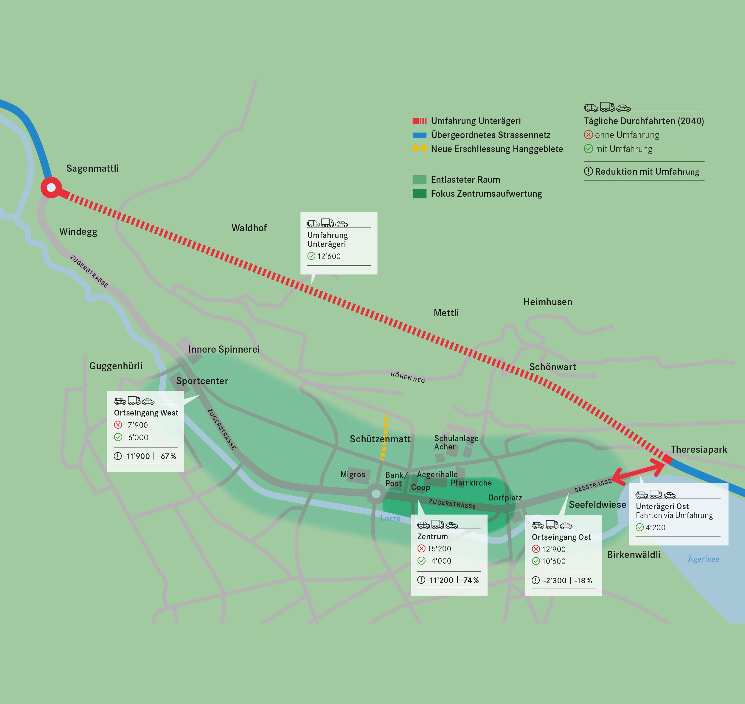 Mit den Umfahrungen kann das Verkehrsaufkommen in den Zentren von Unterägeri und Zug um drei Viertel reduziert werden. Dadurch wird die Sicherheit stark zunehmen und die Lärm- und Luftbelastung markant abnehmen. Zudem bieten die Umfahrungen der Gemeinde Unterägeri und der Stadt Zug die Chance, ihre Zentren nach ihren Vorstellungen aufzuwerten, um die Wohn-, Arbeits-, Bewegungs- und Aufenthaltsqualität in diesen Räumen zu erhöhen und die Verkehrssicherheit zu steigern.