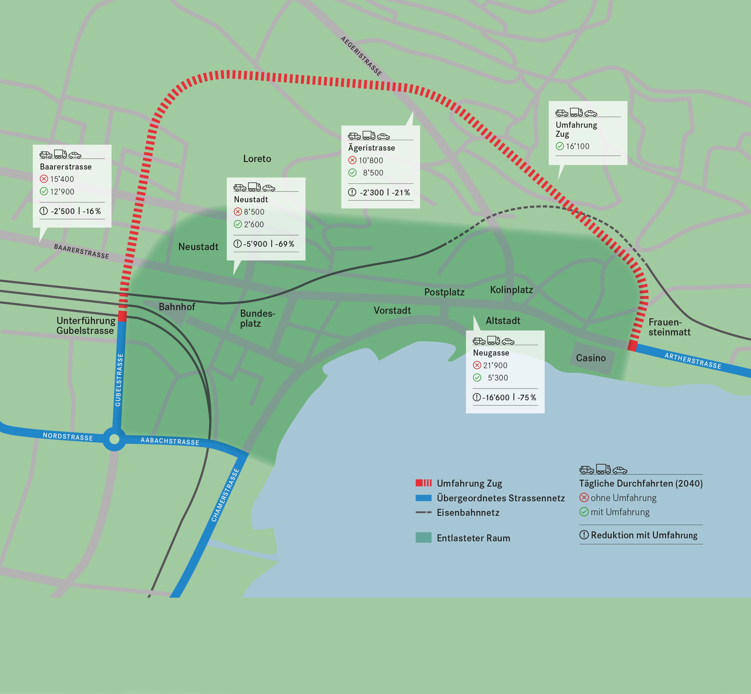 Die Entlastung durch die Umfahrung befreit das Stadtzentrum um drei Viertel des Verkehrsaufkommens. Davon profitieren alle – die Anwohnerinnen und Anwohner und auch das Gewerbe. Ausserdem schafft die Entflechtung Raum für sichere Rad- und Fusswege und unterstützt die Fahrplanstabilität des öffentlichen Verkehrs. Schliesslich bietet die Entlastung die Chance, das Zentrum von Zug, die Einkaufszonen, Arbeitswege, Parks, Plätze und Freiräume attraktiver zu gestalten. Über die künftige Nutzung des neu gewonnenen Raums entscheidet die Stadt Zug in den nächsten Jahren gemeinsam mit der Bevölkerung.